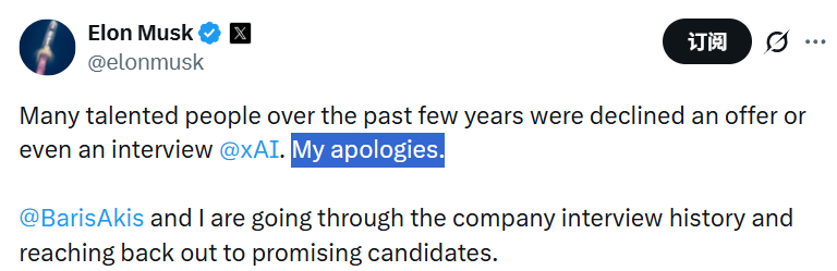 似乎是因为人才密集出走,马斯克也难得展示了一把自省的面貌。他写道,过去几年里,许多有才华的人在申请加入xAI时被拒绝录用,甚至连面试机会都没有获得。对此他 深表歉意 。