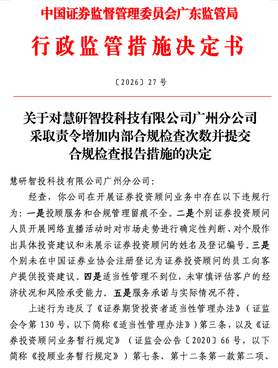 2 月 25 日,广东证监局同日对两家证券投顾机构开出罚单,其中广东博众智能科技投资有限公司被责令改正,慧研智投科技有限公司广州分公司被责令增加内部合规检查次数并提交合规检查报告。