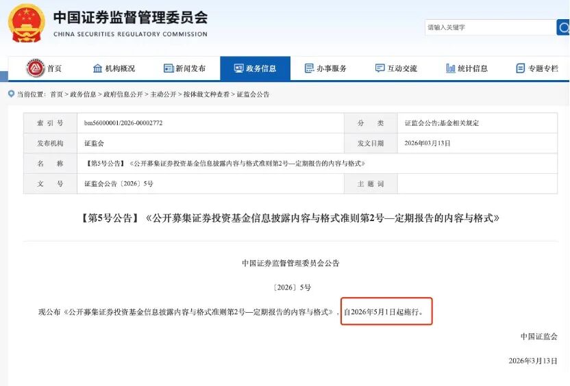 证监会表示,此次发布的《准则》是对原有《证券投资基金信息披露内容与格式准则第2号—年度报告的内容与格式》《第3号—半年度报告的内容与格式》以及《第4号—季度报告的内容与格式》三项独立准则的系统性整合与全面升级。