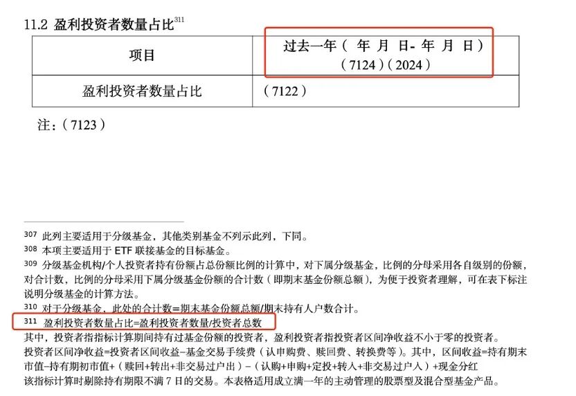 对于成立满一年的主动管理的股票型及混合型基金产品,基金公司需要在半年报、年报中披露过去一年时间里,盈利投资者数量占比,并给出计算公式,即盈利投资者数量占比=盈利投资者数量/投资者总数,其中,投资者指标计算期间持有过基金份额的投资者,盈利投资者指投资者区间净收益不小于零的投资者。