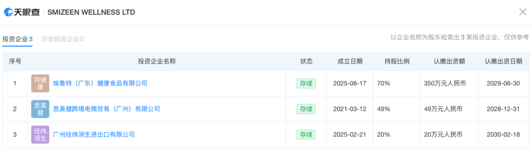 不仅如此,天眼查显示,SMIZEEN WELLNESS LTD在中国境内投资了3家企业,分别是:埃鲁特(广东)健康食品有限公司、思美健跨境电商贸易(广州)有限公司、广州经纬润生进出口有限公司。