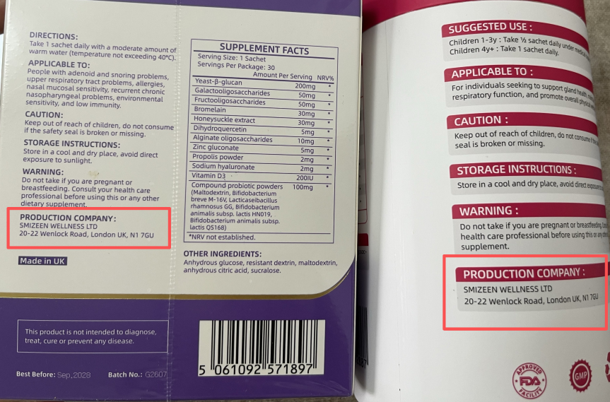 然而,收到产品后,李蕾发现,这两罐分别标榜来自法国和新西兰的益生菌,外包装上标注的生产企业居然为同一家——英国斯迈森健康有限公司(SMIZEEN WELLNESS LTD),企业地址也完全一致。