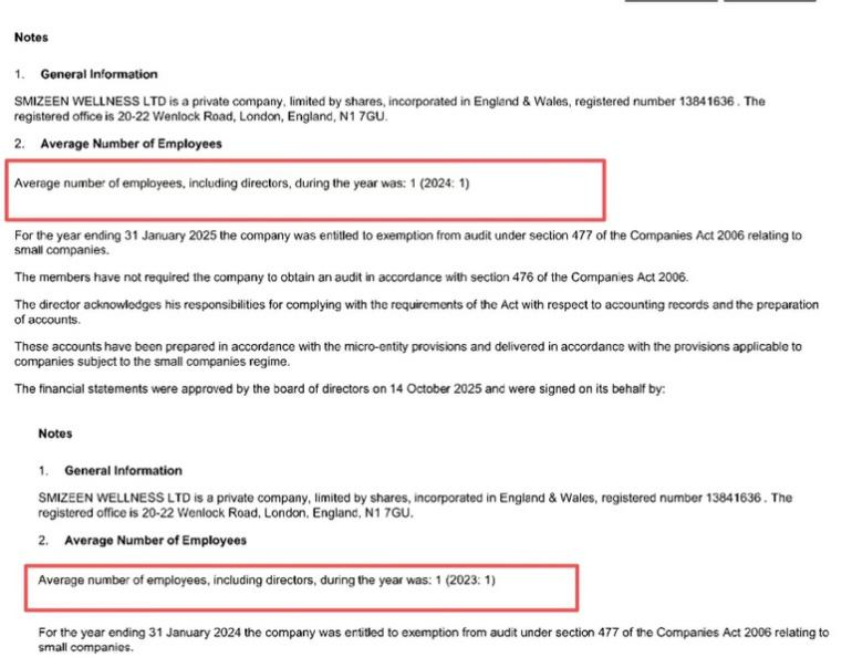 北京商报记者根据李蕾提供产品上标注的生产商,联系英国公司注册处,注册处方面披露的信息显示,Joybaby生产商SMIZEEN WELLNESS LTD于2022年成立,负责人为黄志勇。该公司注册时仅发行1个股本,面值1英镑,实际运营资本起点为1英镑。同时,2023年至2024年,公司员工包括负责人在内仅1人。业务范围包括:糖食制造,均质食品营养食品和其他食品制造。