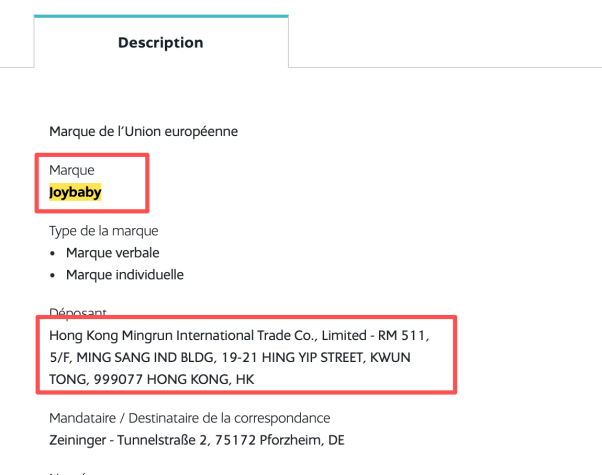 根据Joybaby店铺客服人员提供的信息,Joybaby品牌为法国儿童营养品品牌,隶属于欧盟儿童营养领域,总部位于法国,2024年拓展至中国。这一时间点与倍康国际的成立时间一致。记者通过法国国家工业产权局查询,该品牌持有人为香港铭润国际贸易有限公司。