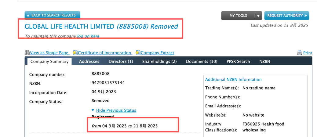 随后北京商报联系香港公司注册处,根据注册处的信息,香港铭润国际贸易有限公司成立于2024年1月,成立时间同样较短。值得注意的是,该公司同时也是宣称“新西兰进口”的LaCture海外旗舰店的运营主体。而新西兰知识产权局官网显示,LaCture品牌所属公司为GLOBAL LIFE HEALTH LIMITED(新西兰全球生命健康有限公司),在新西兰公司注册处官网可以查询到,该公司2023年9月成立,2025年8月已注销。