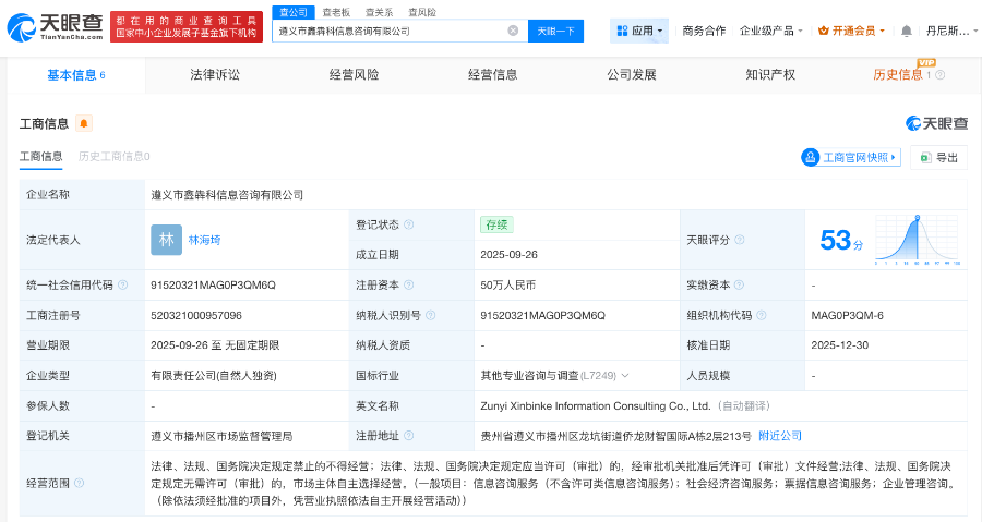 天眼查App显示,遵义市鑫犇科信息咨询有限公司成立于2025年9月,法定代表人为林海埼,注册资本50万人民币,经营范围包括信息咨询服务、社会经济咨询服务、票据信息咨询服务、企业管理咨询,由林海埼全资持股。