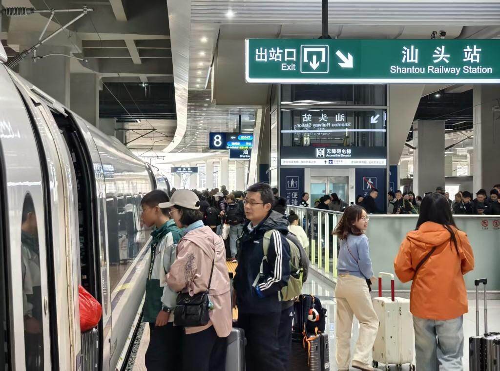 春运期间,汕头站单日最高开行列车225列,累计加开动车组525列,首次开通直达昆明、南宁、贵阳等西部省会城市的高铁。全国通达范围扩大至9个省份、43座城市,汕头至此从铁路末梢一跃成为沿海经济带的关键枢纽节点。