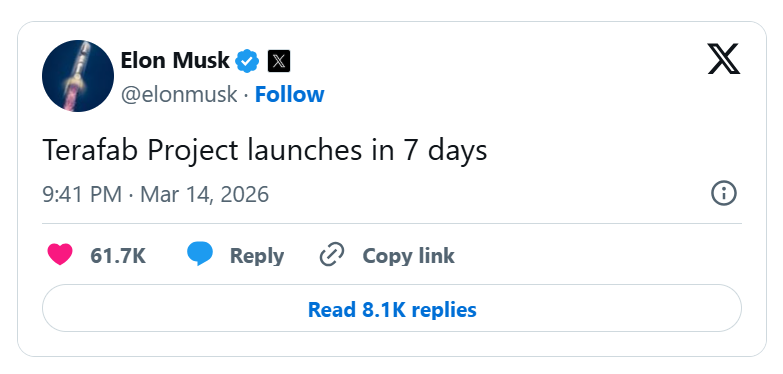 当地时间周六,特斯拉首席执行官埃隆·马斯克在X上发文表示,该公司旨在制造人工智能(AI)芯片的Terafab项目将在七天后启动。