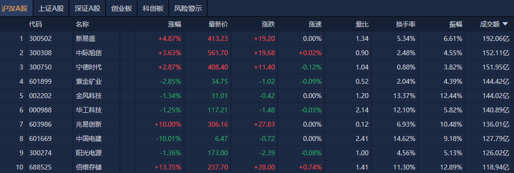 个股方面,新易盛全天成交额超192亿元位居沪深两市第一,中际旭创、宁德时代、紫金矿业等个股成交额居前。