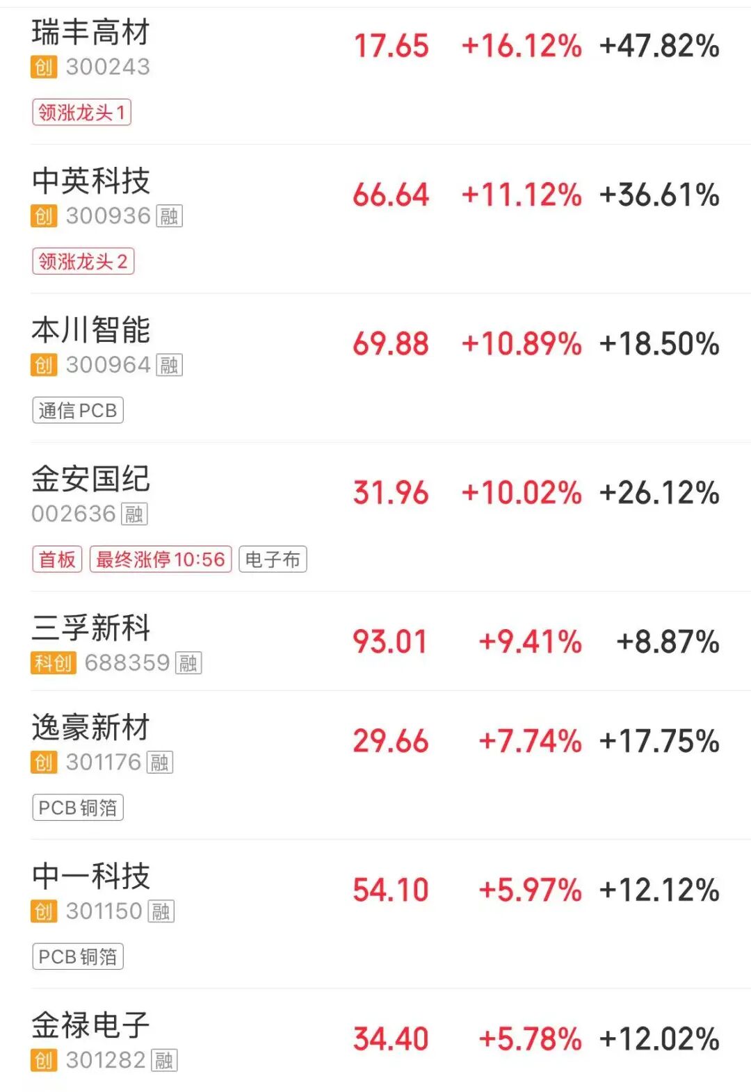 P CB概念持续拉升,金安国纪涨停,中英科技、瑞丰高材均涨超10%。