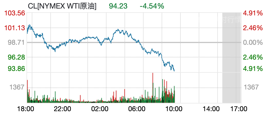 国际原油跳水大跌,WTI原油下挫逾4.5%,布伦特原油失守100美元/桶,日内跌超3%。