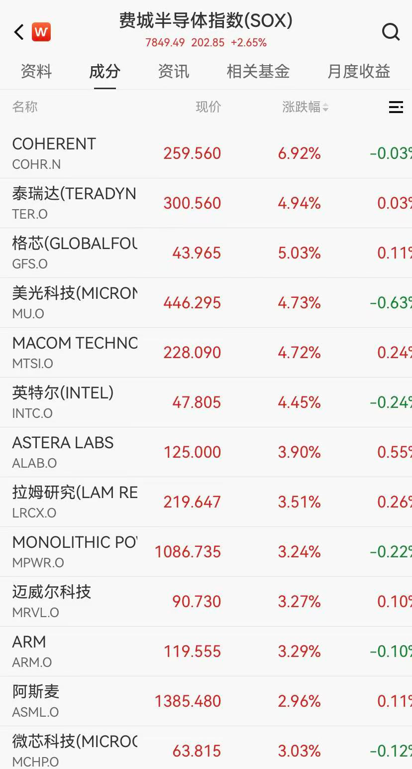 芯片股普涨,费城半导体指数涨超2.6%,其中美光科技涨近5%,本周将公布财报;闪迪涨超7%,英特尔涨超4%。