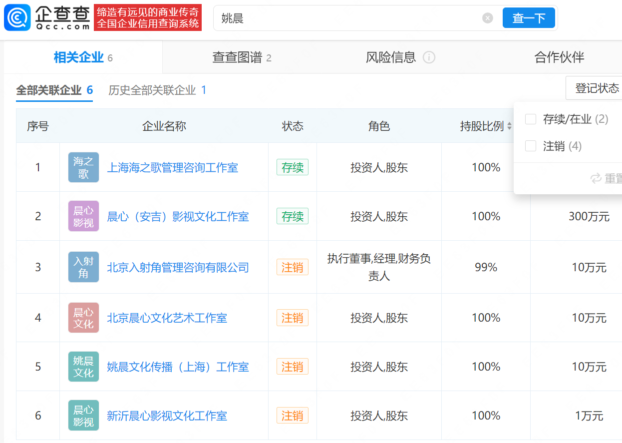 企查查APP显示,姚晨名下关联6家企业,其中4家已注销,上海海之歌管理咨询工作室、晨心(安吉)影视文化工作室为存续状态。
