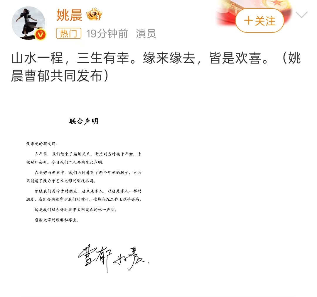 3月16日,姚晨和曹郁发布联合声明官宣离婚:“多年前,我们结束了婚姻关系,考虑到当时孩子年幼,并未对外公布。”“曾经我们是珍贵的朋友,后来是家人,以后是家人一样的朋友。”