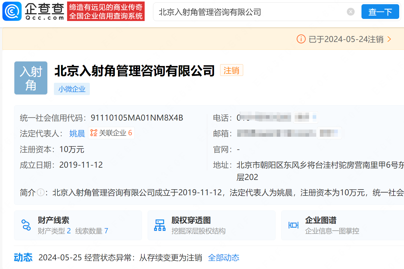 曹郁名下关联6家企业,其中2家已注销,坏兔子(上海)影业有限公司、上海圆舞曲管理咨询工作室、邯郸市明源房地产开发有限公司、探照灯(安吉)影视文化工作室为存续状态。曹郁在上述公司任执行董事、经理、监事等职务。曹郁与姚晨曾经合作北京入射角管理咨询有限公司,该公司已于2024年5月注销,目前两人无共同关联公司。