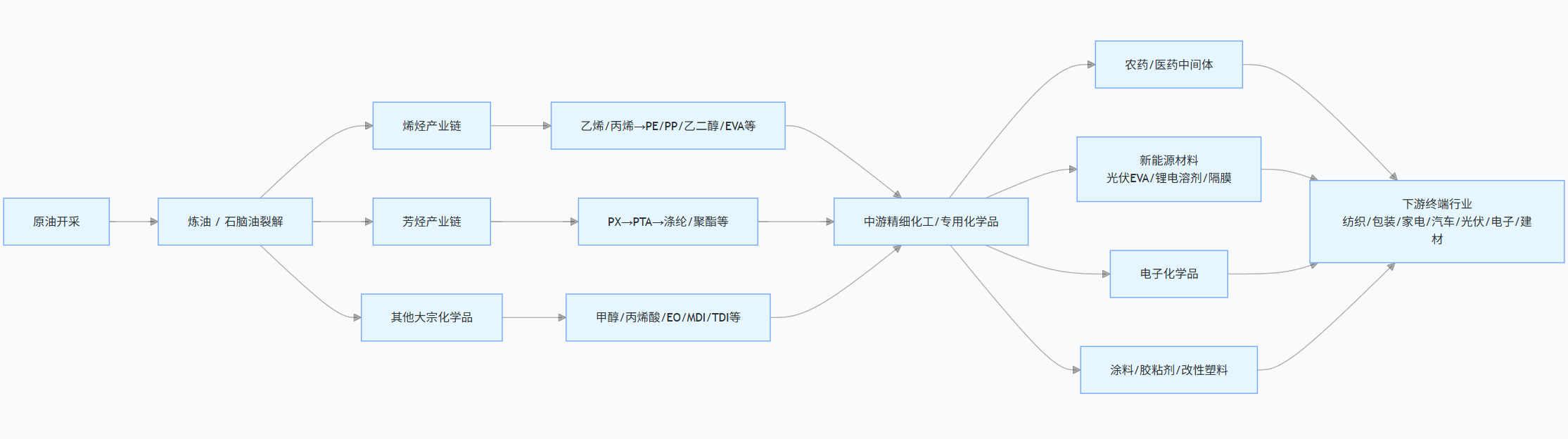 原油价格上涨后,炼油环节产出的石脑油、基础馏分油价格会在1-3天内同步跟涨,是全链条传导的起点。拥有上下游一体化布局的炼化企业,可通过“原油采购-炼油生产-化工品销售”的全链条闭环,锁定价差收益,是油价上行周期中最直接的受益方。