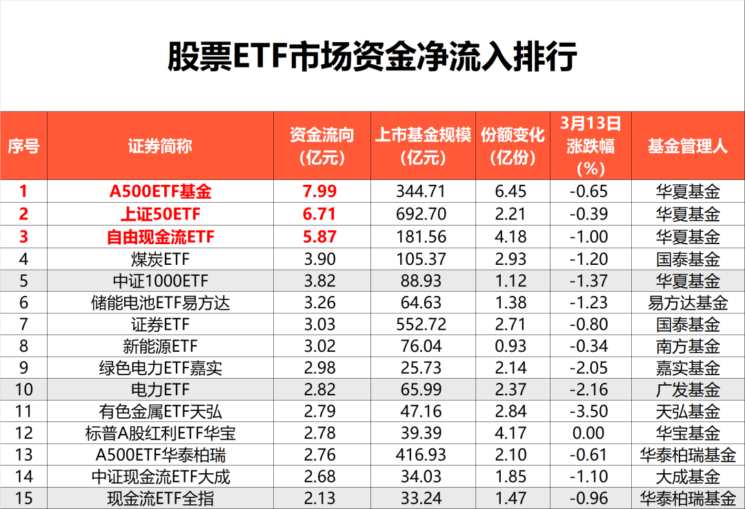 Wind 数据显示,截至 3 月 13 日,全市场 1352 只股票 ETF (含跨境 ETF )总规模达 3.99 万亿元。在股市下跌行情中,股票 ETF 市场净流入资金达 77.35 亿元。