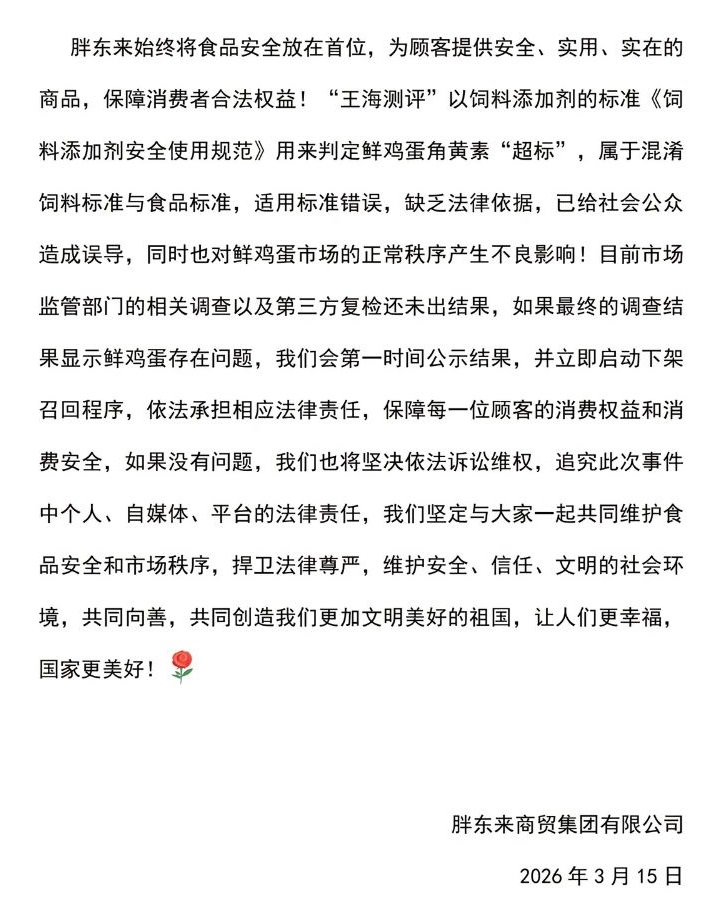 ·目前市场监管部门的相关调查以及第三方复检还未出结果,如果最终的调查结果显示鲜鸡蛋存在问题,会第一时间公示结果,并立即启动下架召回程序,依法承担相应法律责任。如果没有问题,胖东来也将坚决依法诉讼维权,追究此次事件中个人、自媒体、平台的法律责任。