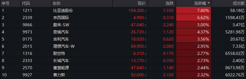 汽车板块集体上涨,比亚迪股份涨近8%,蔚来-SW、奇瑞汽车、吉利汽车等纷纷跟涨。