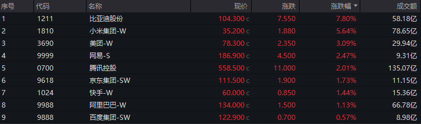 大型科技股集体回暖,小米集团涨超5%,美团涨超3%,腾讯涨超2%。