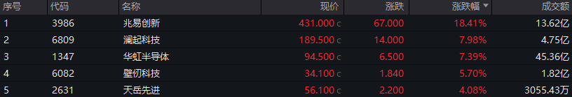 半导体板块走强,兆易创新涨超18%,澜起科技涨近8%,华虹半导体涨超7%。