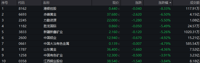 有色金属板块回调,赤峰黄金跌6.5%,中国铝业、山东黄金、中国有色矿业等多股下跌。