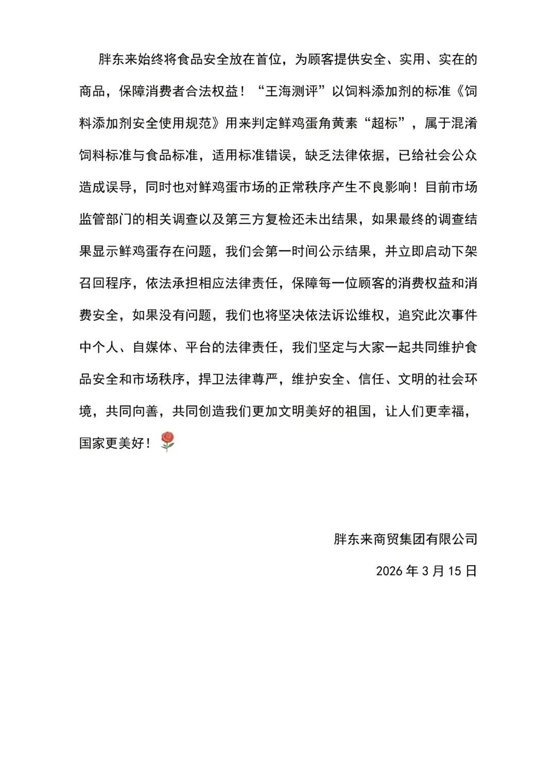 目前市场监管部门的相关调查以及第三方复检还未出结果,如果最终的调查结果显示鲜鸡蛋存在问题,会第一时间公示结果,并立即启动下架召回程序,依法承担相应法律责任。如果没有问题,胖东来也将坚决依法诉讼维权,追究此次事件中个人、自媒体、平台的法律责任。