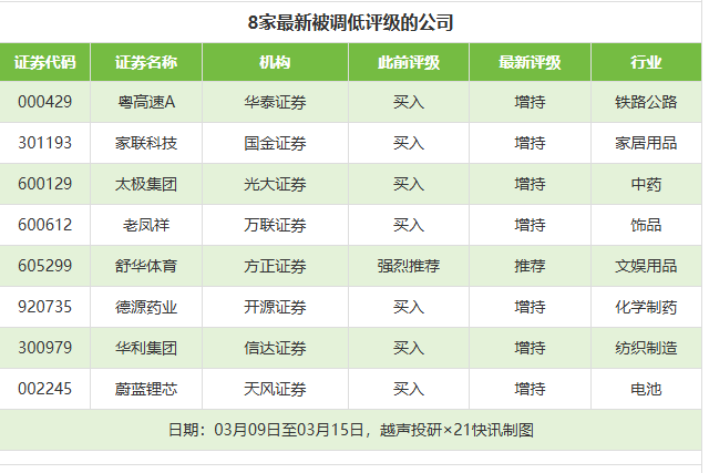 评级调低方面,3月9日至3月15日,券商调低上市公司评级达到8家次,最新数据包括了华泰证券对粤高速A的评级从“买入”调低至“增持”,国金证券对家联科技的评级从“买入”调低至“增持”,光大证券对太极集团的评级从“买入”调低至“增持”。