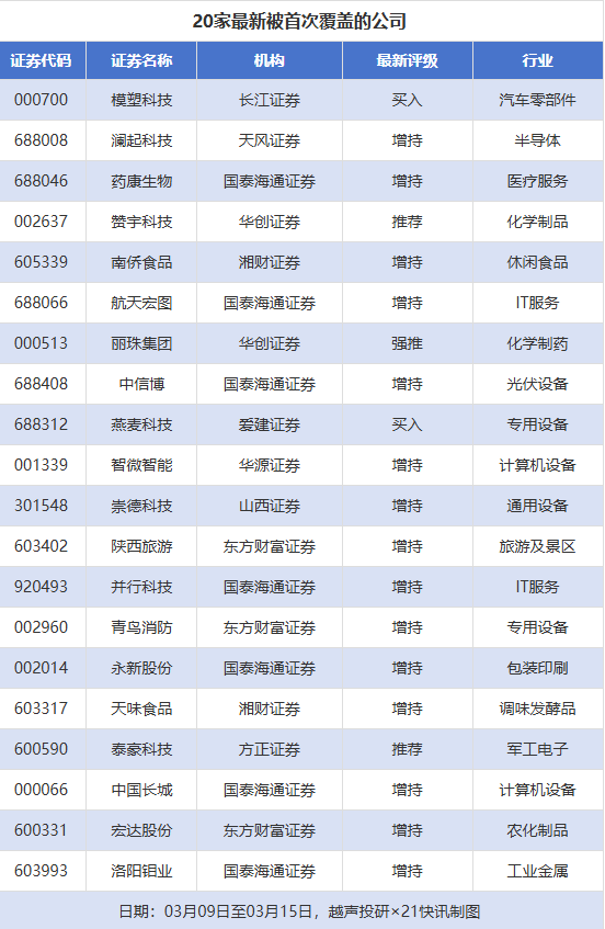 首次覆盖方面,3月9日至3月15日券商共给出了77次首次覆盖,其中模塑科技获得长江证券给予“买入”评级,澜起科技获得天风证券给予“增持”评级,药康生物获得国泰海通证券给予“增持”评级,赞宇科技获得华创证券给予“推荐”评级,南侨食品获得湘财证券给予“增持”评级。