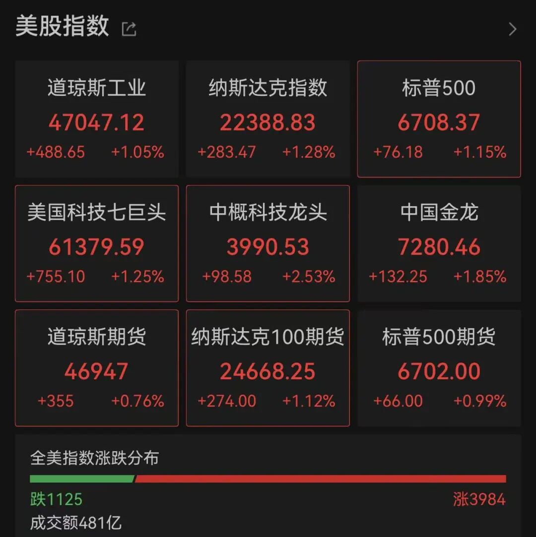 截至发稿, 道指涨1.05%, 纳指涨1.28%, 标普500指数涨1.15%。 有3984只个股上涨,1125只个股下跌。
