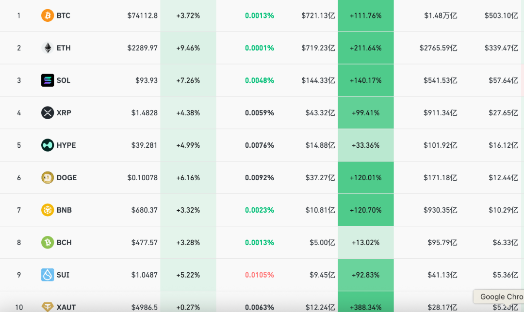 加密货币全线上涨, 截至发稿,比特币涨3.72%,报74112.8美元。 以太坊币涨超9%。