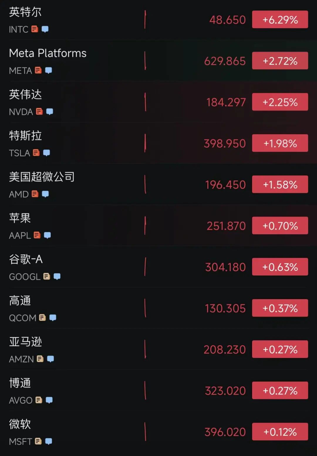 美股大型科技股多数上涨,截至发稿,英特尔大涨6.29%,Meta涨超2.7%,英伟达涨超2%,特斯拉涨超1.9%,苹果、微软、亚马逊、谷歌均上涨。