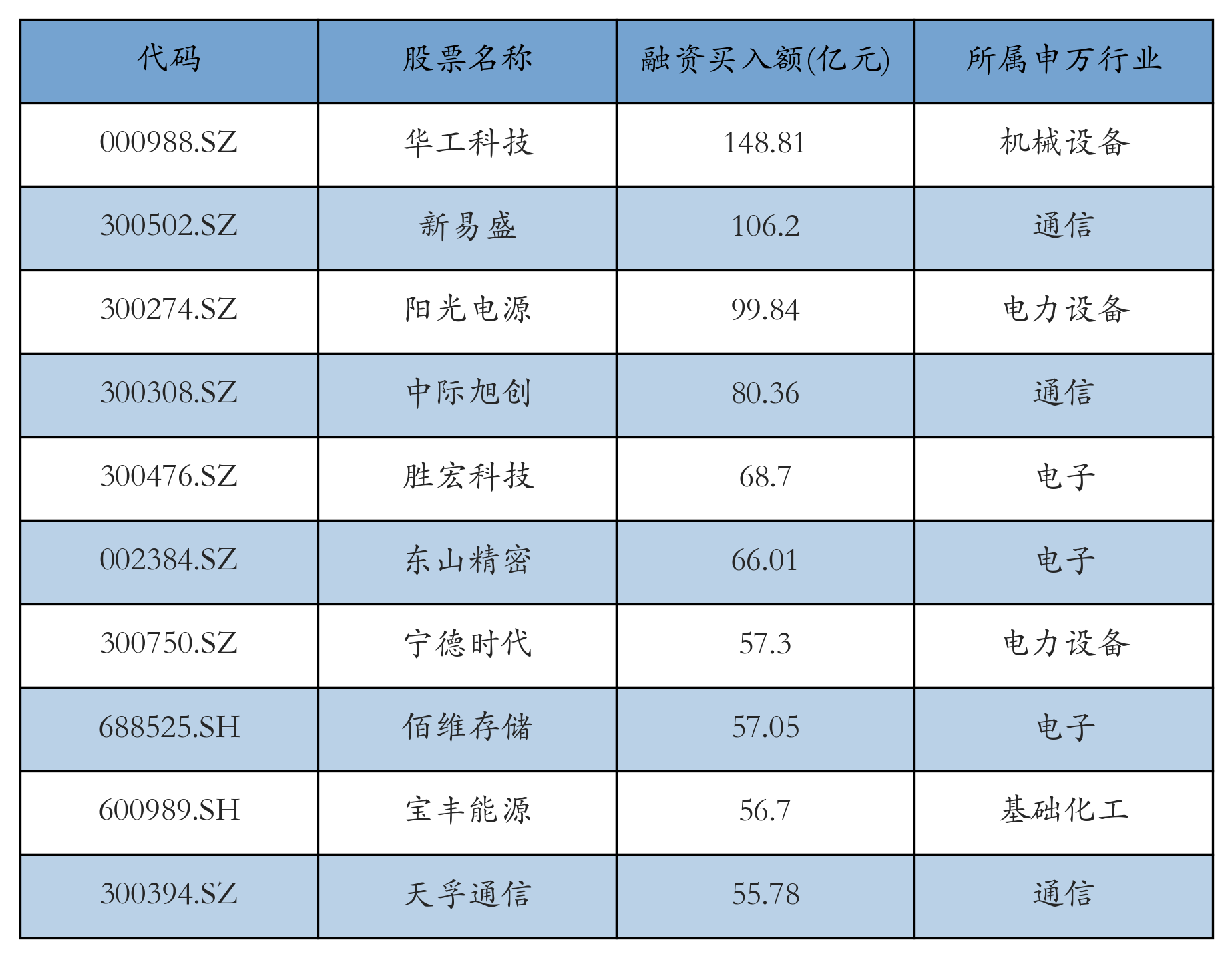 上周两市共有3488只个股有融资资金买入,共有228只个股买入金额超10亿元,其中华工科技、新易盛、阳光电源排名前三,买入金额分别148.81亿元、106.2亿元、99.84亿元。融资买入额前10个股详情见下表: