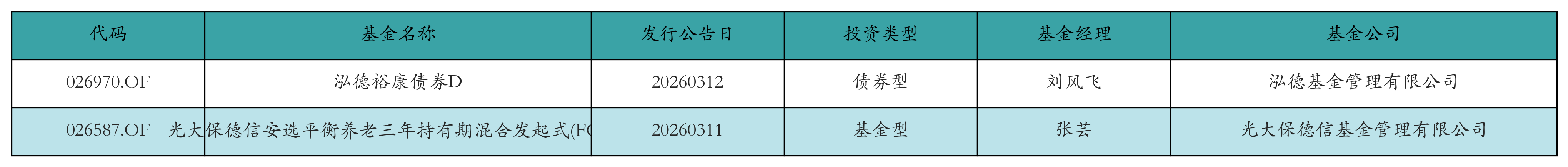 上周有2只新基金发行,分别为:泓德裕康债券D、光大保德信安选平衡养老三年持有期混合发起式(FOF)Y,详情见下表: