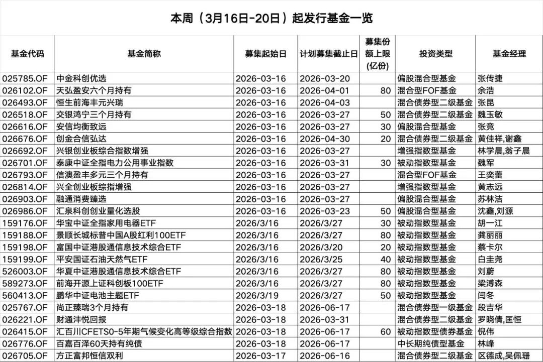 3月16日至3月20日当周,24只新基金登台亮相。周一(3月16日)仍是新基金发行的关键日,本周新发基金中18只在周一启动发行,占比超七成;周二、周三、周四各有1只、4只、1只新基金启动募集。
