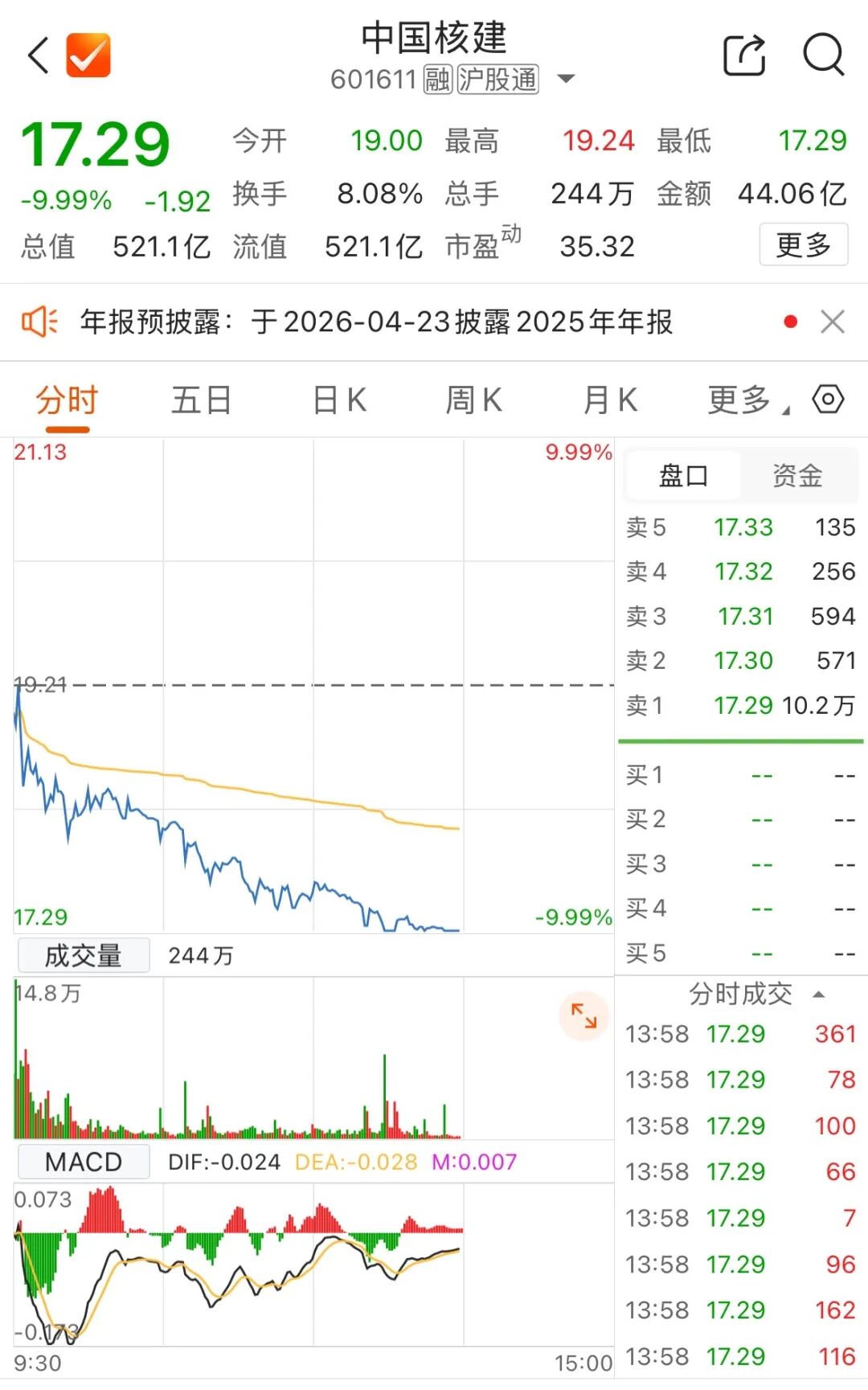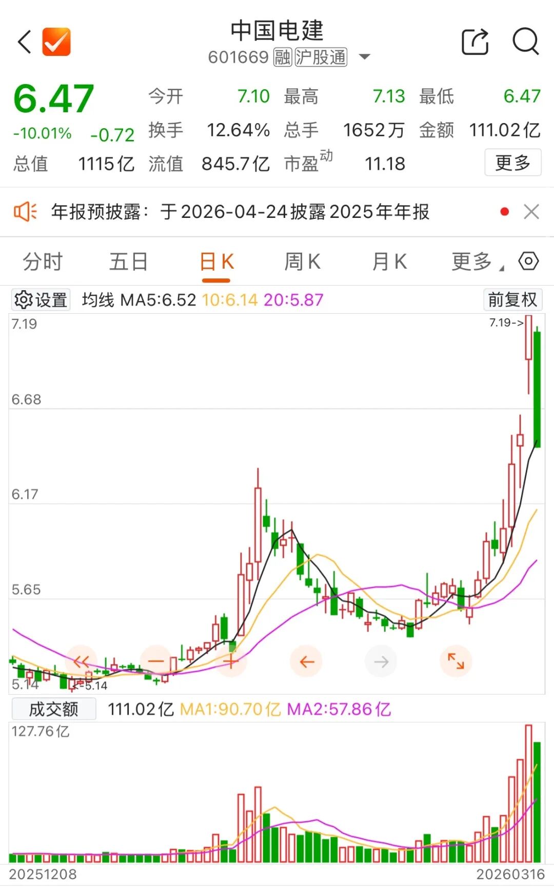 中国电建盘中跌停,截至发稿报6.47元/股,成交额超111亿元,最新市值为1115亿元。此前, 中国电建股价持续大涨,上周五放量涨停。