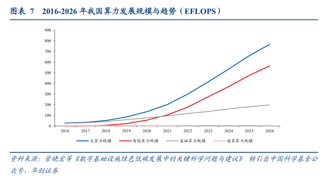 国内市场,AI驱动数据中心规模快速扩张,智能算力占比不断提升。华创证券指出,AI驱动数据中心规模快速扩张,智能算力占比不断提升。据预测我国2026年算力总规模将达到767 EFlops,()2021~2026年CAGR约为31%,同时智能算力的占比从2016年的3%提升至2026年的73%。