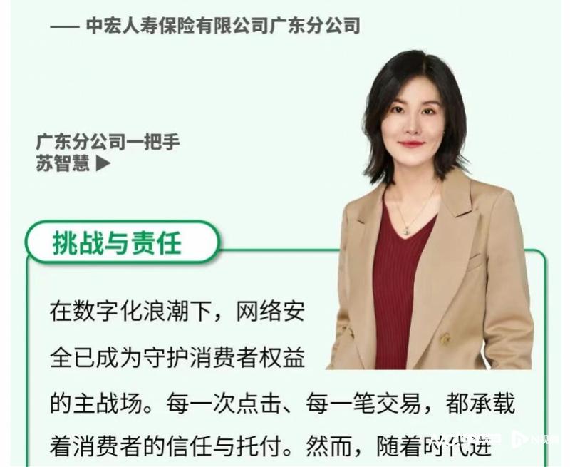 据中宏保险官方客户服务资讯平台消息,2026年3月4日,苏智慧以中宏人寿广东分公司一把手身份,谈及“数字时代的信任契约”时,指出在数字化浪潮下,网络安全已成为守护消费者权益的主战场,表示将持续完善网络安全体系建设。