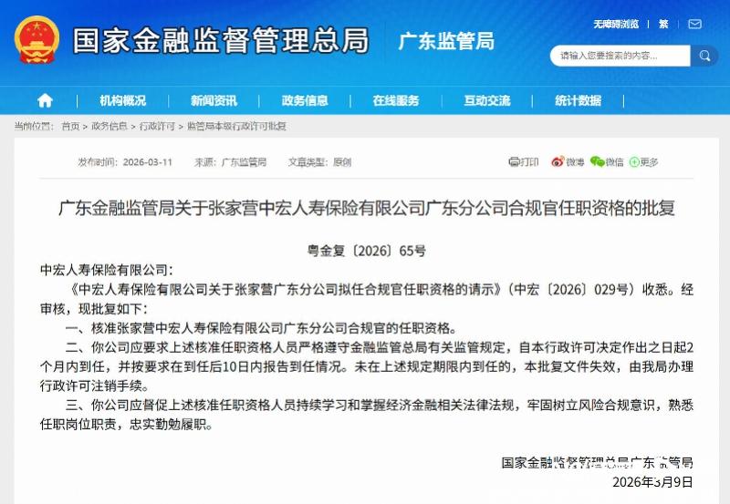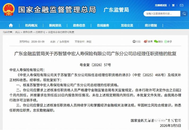 近日,国家金融监督管理总局广东监管局下发两份批复,正式核准苏智慧、张家营分别担任中宏人寿保险有限公司广东分公司(下称“中宏人寿广东分公司”)总经理、合规官的任职资格。