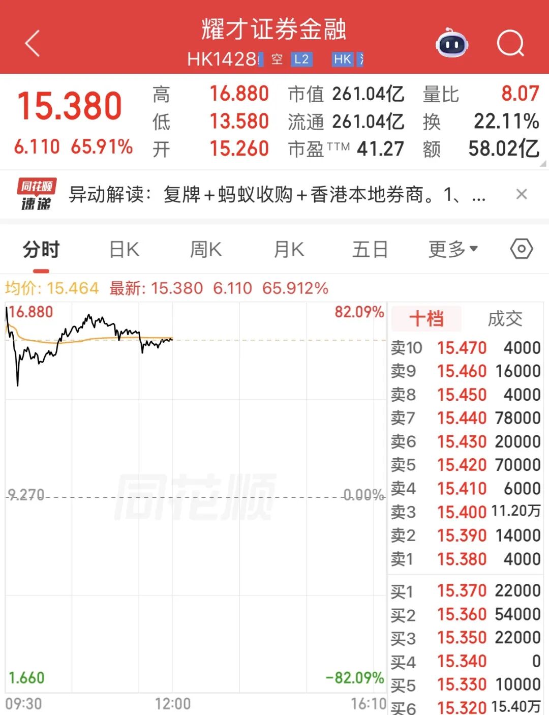 耀才证券金融股票于3月16日短暂停牌后,3月17日开市起复牌,复牌后股价大涨,盘中一度涨超82%。截至上午收盘,耀才证券金融股价涨65.91%,报15.38港元/股,最新市值为261.04亿港元。