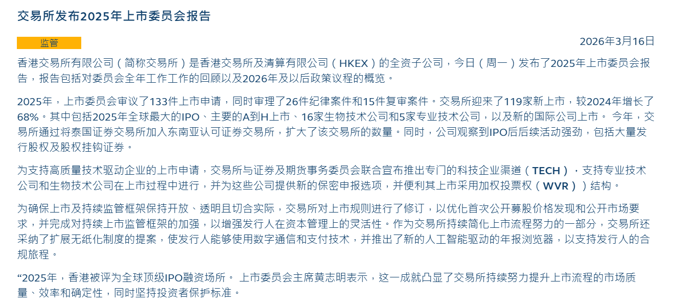 从港股市场环境来看,目前也为企业赴港上市提供了较好的窗口。港交所日前发布报告显示,2025年交易所迎来了119家新上市,较2024年增长了68%。其中包括2025年全球最大的IPO、主要的A到H上市、16家生物技术公司。