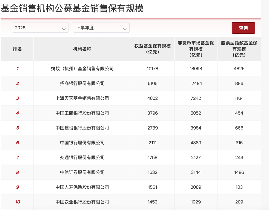 蚂蚁基金依旧占据榜单首位。数据显示,2025年下半年,蚂蚁基金权益基金保有规模达1.02万亿元,较上半年的8229亿元增长23.7%,正式突破万亿元大关,成为业界首个在权益基金单项上保有规模破万亿的销售机构,仅凭一己之力便占据了百强机构16.98%的权益市场份额。