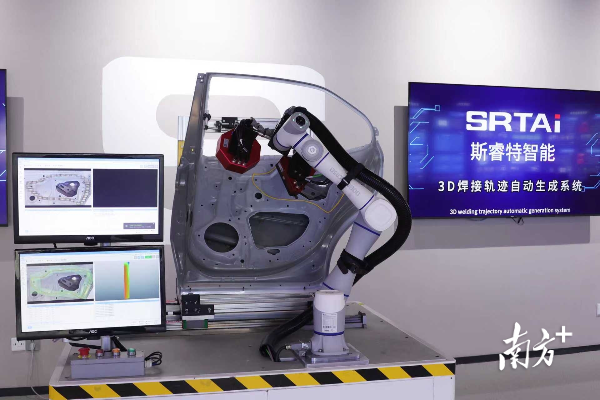 在园区A2栋,广州市斯睿特智能科技有限公司的展厅里,一排排工业机器人正向大家演示着内嵌智能体的涂胶检测、轨迹生成等高柔性操作。这家成立八年的国家级高新技术企业、广东省专精特新企业,一直以来致力于为制造业提供领先的工业AI解决方案。