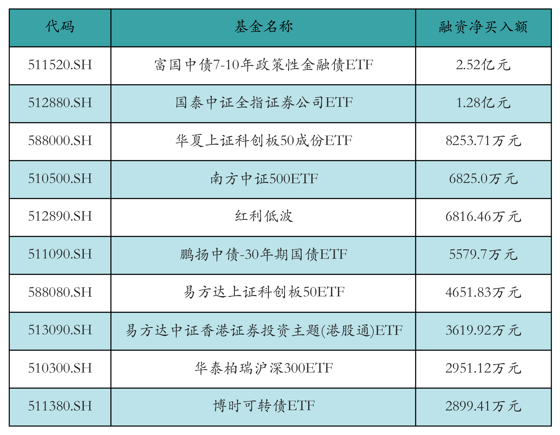 3月16日ETF融资净买入额前三位分别为:富国中债7-10年政策性金融债ETF(2.52亿元)、国泰中证全指证券公司ETF(1.28亿元)和华夏上证科创板50成份ETF(8253.71万元),前10具体见下表:
