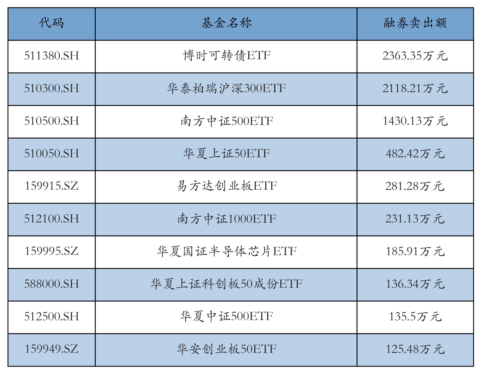 3月16日ETF融券卖出额前三位分别为:博时可转债ETF(2363.35万元)、华泰柏瑞沪深300ETF(2118.21万元)和南方中证500ETF(1430.13万元),前10具体见下表: