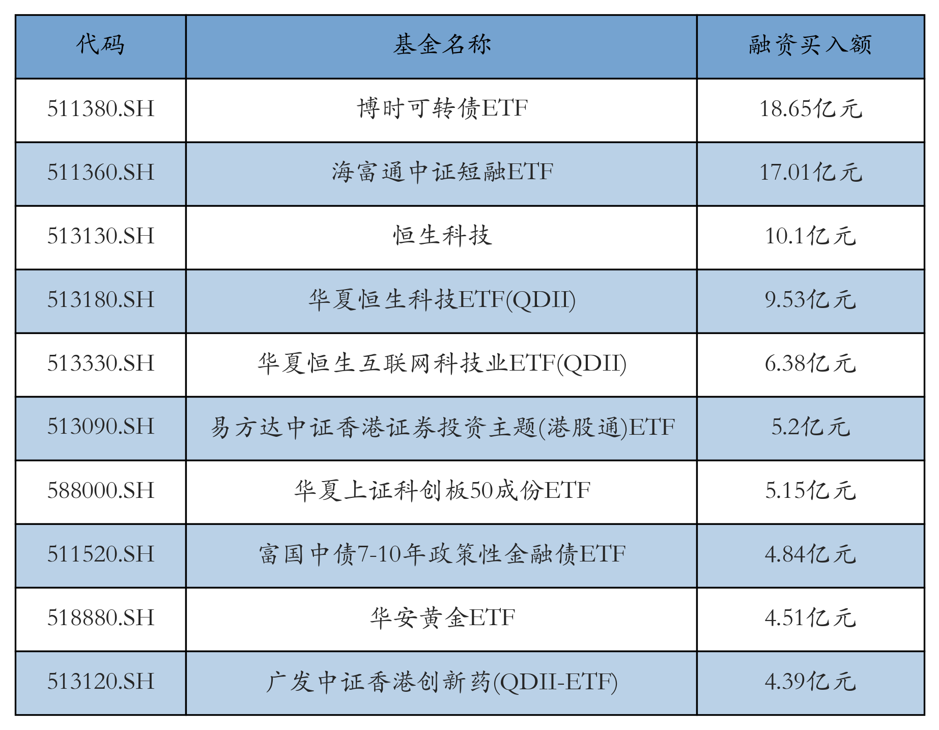 3月16日ETF融资买入额前三位分别为:博时可转债ETF(18.65亿元)、海富通中证短融ETF(17.01亿元)和恒生科技(10.1亿元),前10具体见下表: