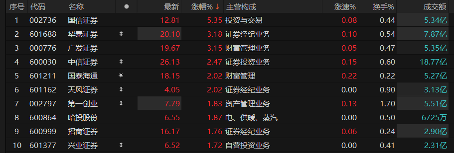 3月17日,证券板块高开高走,国信证券涨超5%,华泰证券、广发证券涨超3%,中信证券、国泰海通、天风证券等跟涨。