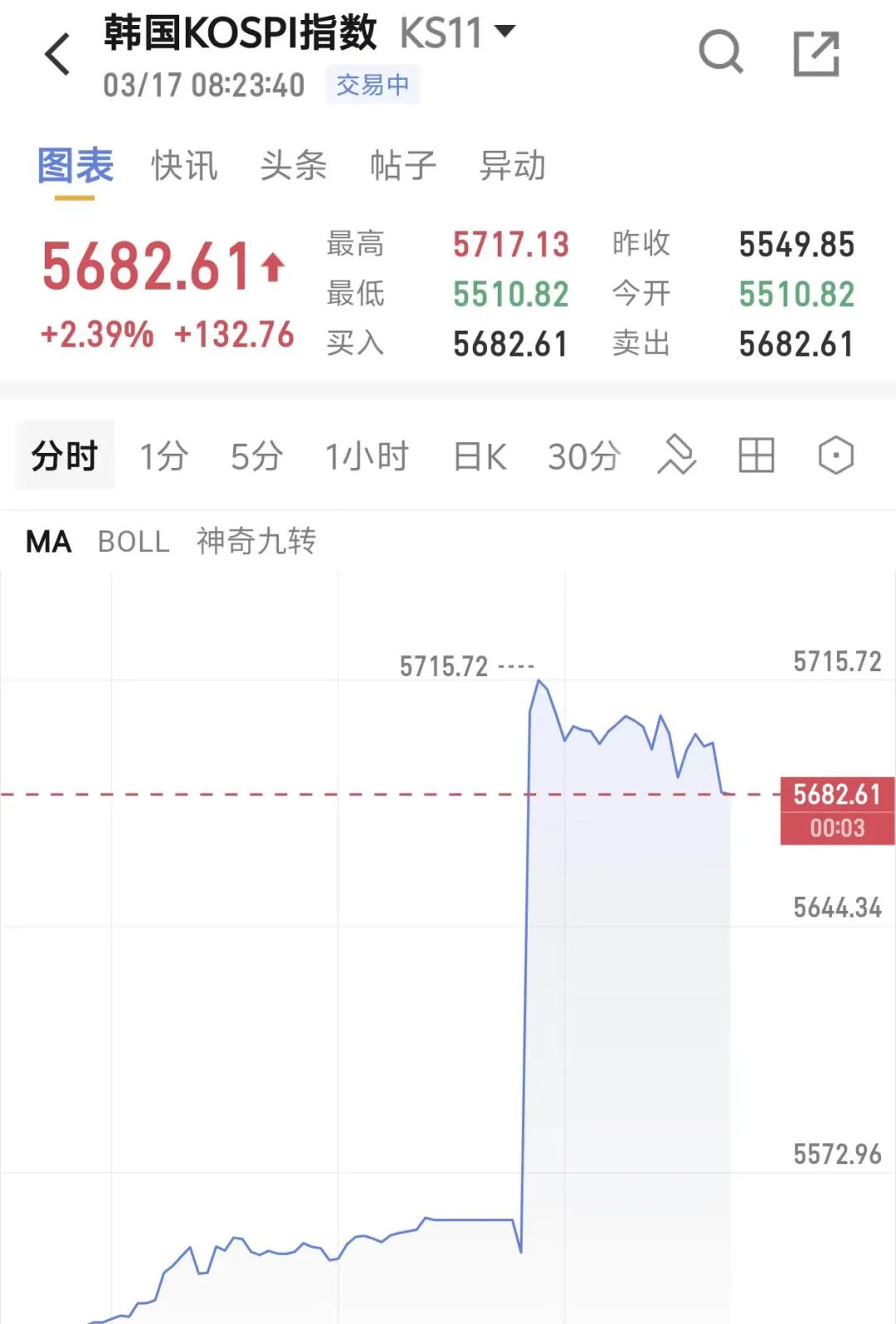 3月17日,日韩股市高开。日经225指数开盘大涨,截至发稿涨幅扩大至1%,涨幅超600点,报54355.76点。韩国KOSPI指数开盘上涨152.92点,涨幅2.76%,报5702.77点,截至发稿涨幅收窄至2.39%。