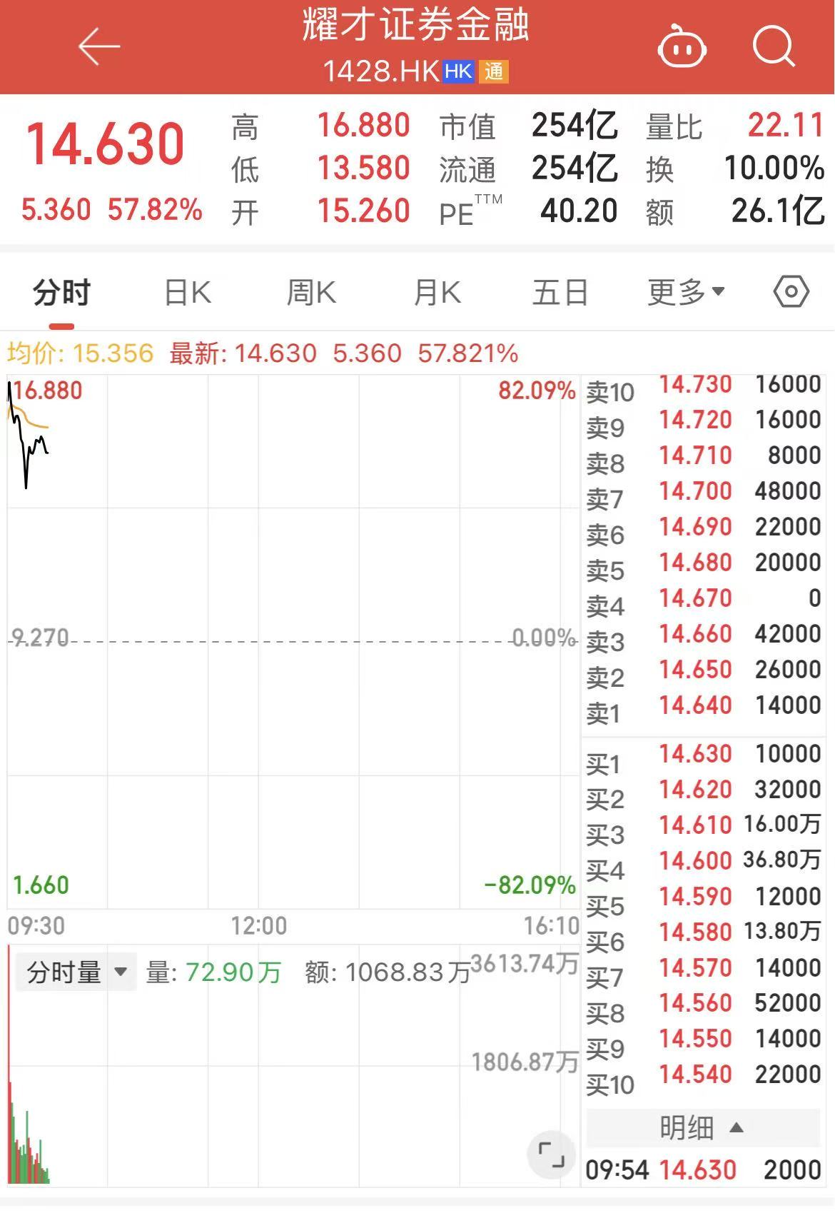3月17日,香港老牌券商耀才证券金融(01428.HK)复牌后股价飙升,盘中一度涨超80%,截至9时55分,涨幅为57.82%,报14.63港元/股。