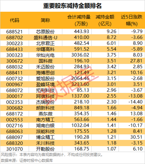 其次是盛科通信-U,减持量为410万股,减持金额8.72亿元;北京君正近5日遭股东减持6.01亿元,位居股东减持榜第三。